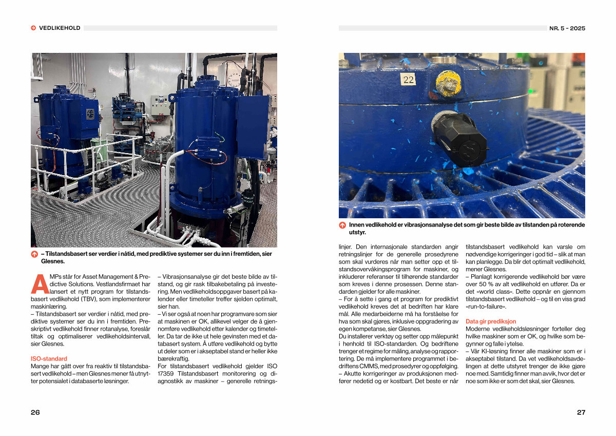 linjer. Den internasjonale standarden angir retningslinjer for de generelle prosedyrene som skal vurderes når man setter opp et tilstandsovervåkingsprogram for maskiner, og inkluderer referanser til tilhørende standarder som kreves i denne prosessen. Denne standarden gjelder for alle maskiner. – For å sette i gang et program for prediktivt vedlikehold kreves det at bedriften har klare mål. Alle medarbeiderne må ha forståelse for hva som skal gjøres, inklusive oppgradering av egen kompetanse, sier Glesnes. Du installerer verktøy og setter opp målepunkt i henhold til ISO-standarden. Og bedriftene trenger et regime for måling, analyse og rapportering. De må implementere programmet i bedriftens CMMS, med prosedyrer og oppfølging. – Akutte korrigeringer av produksjonen medfører nedetid og er kostbart. Det beste er når