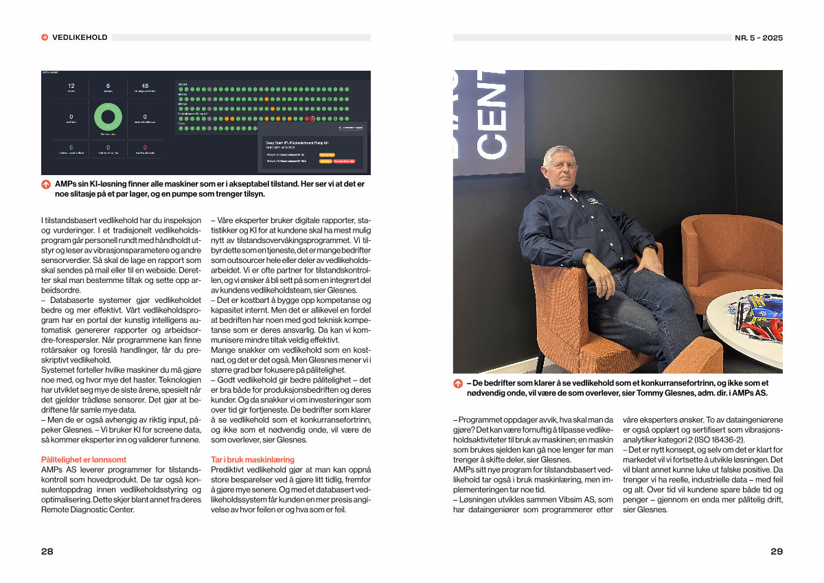 – Programmet oppdager avvik, hva skal man da gjøre? Det kan være fornuftig å tilpasse vedlikeholdsaktiviteter til bruk av maskinen; en maskin som brukes sjelden kan gå noe lenger før man trenger å skifte deler, sier Glesnes. AMPs sitt nye program for tilstandsbasert vedlikehold tar også i bruk maskinlæring, men implementeringen tar noe tid. – Løsningen utvikles sammen Vibsim AS, som har dataingeniører som programmerer etter