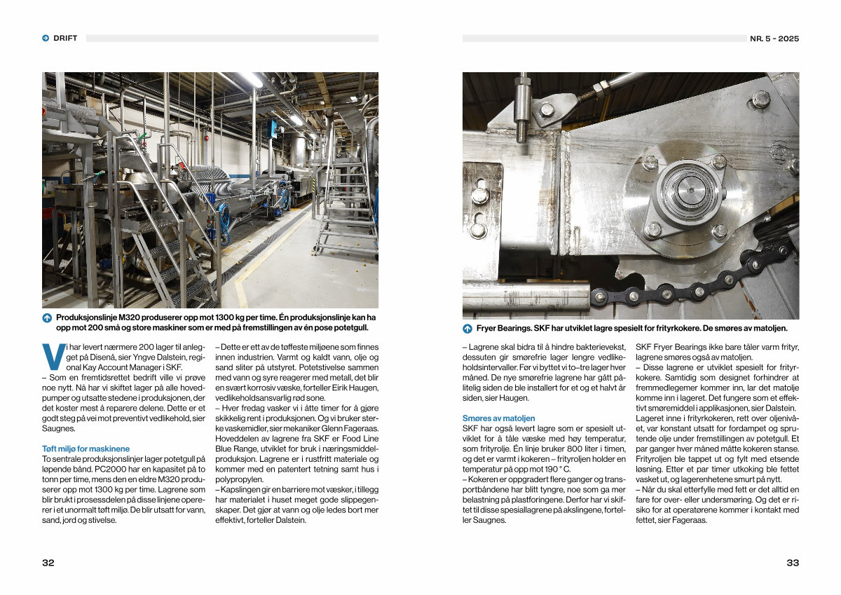 Smøres av matoljen SKF har også levert lagre som er spesielt utviklet for å tåle væske med høy temperatur, som frityrolje. Én linje bruker 800 liter i timen, og det er varmt i kokeren – frityroljen holder en temperatur på opp mot 190 ° C. – Kokeren er oppgradert flere ganger og transportbåndene har blitt tyngre, noe som ga mer belastning på plastforingene. Derfor har vi skiftet til disse spesiallagrene på akslingene, forteller Saugnes.