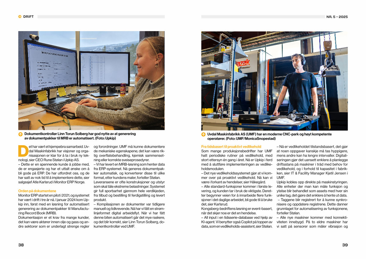 Fra tidsbasert til proaktivt vedlikehold Som mange produksjonsbedrifter har UMF hatt periodiske rutiner på vedlikehold, med stort ettersyn én gang i året. Nå er Upkip i ferd med å sluttføre implementeringen av vedlikeholdsmodulen. – Det nye vedlikeholdssystemet gjør at vi kommer over på proaktivt vedlikehold. Nå kan vi være i forkant av hendelser, sier Håkegård. – Alle standard-funksjoner kommer i første levering, og kunden tar i bruk de viktigste. Deretter begynner veien for å innarbeide flere funksjoner i det daglige arbeidet, bli gode til å bruke det, sier Karlsrud. Kongsberg-bedriftens løsning er event-basert, når det skjer noe er det en hendelse. – All input i en tidsserie-database ved hjelp av KI-agent. Vi benytter også Copilot på toppen av data, som en vedlikeholds-assistent, sier Stølan.