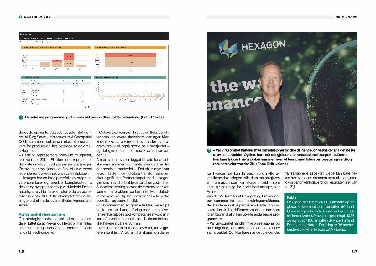 – Octave skal være en kreativ og fleksibel aktør som kan levere skalerbare løsninger. Men vi skal ikke bare være en leverandør av programvare, vi vil også støtte hele prosjektet – og det gjør vi sammen med Prevas, sier van der Zijl. Amrén sier at avtalen legget til rette for at selskapene sammen kan møte økende krav fra det nordiske markedet. – Det skjer mye i vår region, takten i den digitale transformasjonen øker signifikant. Partnerskapet med Hexagon gjør oss i stand til å takle dette på en god måte. Suboptimalisering som enkle reparasjoner kan løse et lite problem, på kort sikt. Men datadrevne systemer hjelper bedriften til å få bedre oversikt – og bedre innsikt. – Vi kommer med en grunnstruktur, basert på beste praksis. Lang erfaring med kundeleveranser har gitt oss god kompetanse i hvordan vi kan løfte vedlikeholdsarbeidet i virksomhetene til et høyere nivå, sier Amrén. – Når vi jobber med kunden over tid, kan vi gjøre en forskjell. Vi bidrar til å skape forståelse