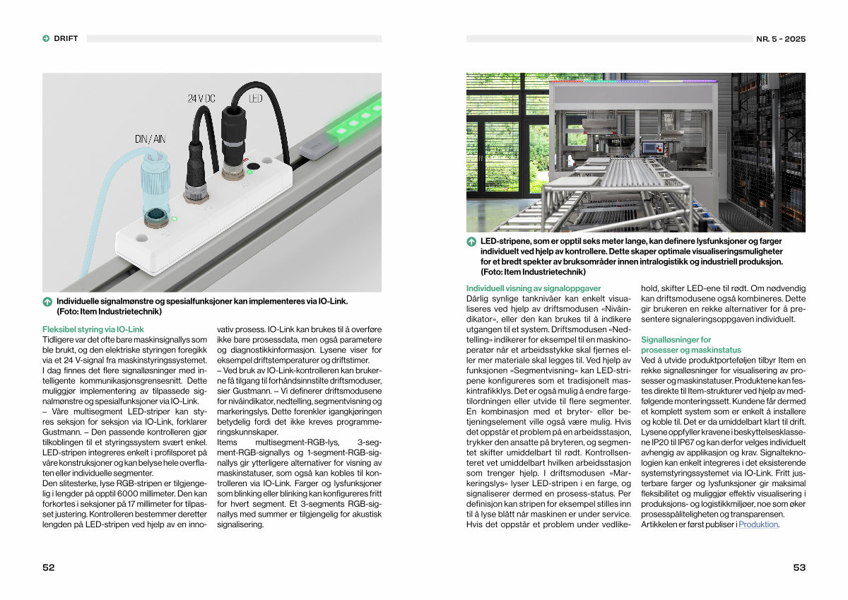 Fleksibel styring via IO-Link Tidligere var det ofte bare maskinsignallys som ble brukt, og den elektriske styringen foregikk via et 24 V-signal fra maskinstyringssystemet. I dag finnes det flere signalløsninger med intelligente kommunikasjonsgrensesnitt. Dette muliggjør implementering av tilpassede signalmønstre og spesialfunksjoner via IO-Link. – Våre multisegment LED-striper kan styres seksjon for seksjon via IO-Link, forklarer Gustmann. – Den passende kontrolleren gjør tilkoblingen til et styringssystem svært enkel. LED-stripen integreres enkelt i profilsporet på våre konstruksjoner og kan belyse hele overflaten eller individuelle segmenter. Den slitesterke, lyse RGB-stripen er tilgjengelig i lengder på opptil 6000 millimeter. Den kan forkortes i seksjoner på 17 millimeter for tilpasset justering. Kontrolleren bestemmer deretter lengden på LED-stripen ved hjelp av en innovativ prosess. IO-Link kan brukes til å overføre ikke bare prosessdata, men også parametere og diagnostikkinformasjon. Lysene viser for eksempel driftstemperaturer og driftstimer. – Ved bruk av IO-Link-kontrolleren kan brukerne få tilgang til forhåndsinnstilte driftsmoduser, sier Gustmann. – Vi definerer driftsmodusene for nivåindikator, nedtelling, segmentvisning og markeringslys. Dette forenkler igangkjøringen betydelig fordi det ikke kreves programmeringskunnskaper. Items multisegment-RGB-lys, 3-segment-RGB-signallys og 1-segment-RGB-signallys gir ytterligere alternativer for visning av maskinstatuser, som også kan kobles til kontrolleren via IO-Link. Farger og lysfunksjoner som blinking eller blinking kan konfigureres fritt for hvert segment. Et 3-segments RGB-signallys med summer er tilgjengelig for akustisk signalisering.