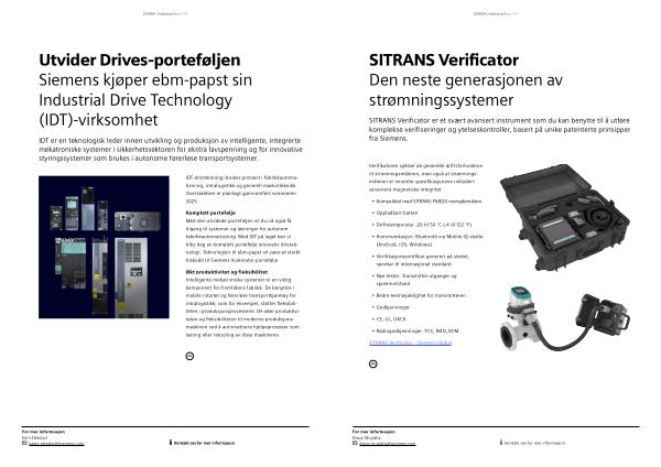 Komplett portefølje Med den utvidede porteføljen vil du nå også få tilgang til systemer og løsninger for autonom fabrikkautomatisering . Med IDT på laget kan vi tilby deg en komplett portefølje innovativ drivteknologi . Teknologien til ebm-papst vil være et sterkt tilskudd til Siemens Xcelerator-portefølje .