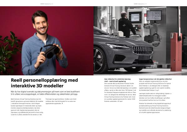 Gjør sikkerhet for elektriske kjøretøy reell – med virtuell opplæring Den svenske elbil-produsenten Polestar bruker Siemens Virtual Training Solutions aktivt i sin service . Service av elektriske kjøretøy er en sjelden affære , og det er ikke uten farer . På Polestar 2 må for eksempel høyspenningsbatteriet slås av i flere trinn i en obligatorisk rekkefølge før service . Med Virtual Training Solutions har Polestar tatt i bruk en ny global opplæringsmetode for nesten 1000 Polestar verksteder i 27 land .