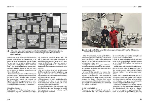 Fleksibilitet i piloten Fabrikken bruker stort sett kjente prosesser i sementproduksjonen. Men dette skal styres og kontrolleres. Cemonite bruker IP67 IOlink for distribuert kontroll. De har plassert ut 29 IO-Link-mastere som fungerer som gateway-er for tilkobling av enheter som sensorer, ventiler og digital IO. Masterne overfører maskindata, prosessparametere og diagnosedata til en IPC. – Du kan kan kontrollere hele fabrikken med én IPC, men det kan være fornuftig å sette opp også en redundant som speiler denne. Skulle den første svikte, vil kritiske operasjoner fortsatt kjøres, forklarer Hjelset. – Piloten begynte så smått med tradisjonelle, harde PLS-er, men disse er mer krevende å koble til IO. Derfor ønsket vi å gå over til en mer anvendelig løsning, forteller Gimre. Et industrielt pilotanlegg er under stadig utvikling. Derfor har det vært viktig med en teknisk løsning og programvare som enkelt lar seg tilpasse og justere underveis.