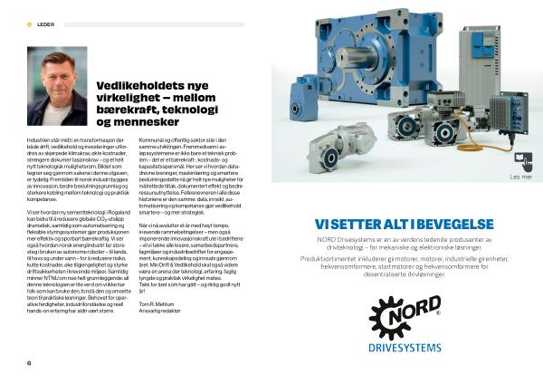 Industrien står midt i en transformasjon der både drift, vedlikehold og investeringer utfordres av skjerpede klimakrav, økte kostnader, strengere dokumentasjonskrav – og et helt nytt teknologisk mulighetsrom. Bildet som tegner seg gjennom sakene i denne utgaven, er tydelig: Fremtiden til norsk industri bygges av innovasjon, bedre beslutningsgrunnlag og sterkere kobling mellom teknologi og praktisk kompetanse.