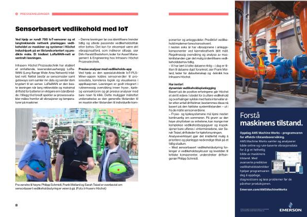 ponenter og anleggsdeler. Prediktivt vedlikehold implementeres konsekvent. I nesten seks år har vibrasjonene i anleggskomponenter ved kjernekraftverk blitt målt. Regelmessig overvåking og analyse av maskintilstanden gjør det mulig å identifisere vedlikeholdsbehov tidlig. – Vi har lært å tolke dataene riktig – i dag er tilliten til dataene dypt forankret, sier Frank Mollard, leder for datavitenskap og-teknikk hos Infraserv Höchst.