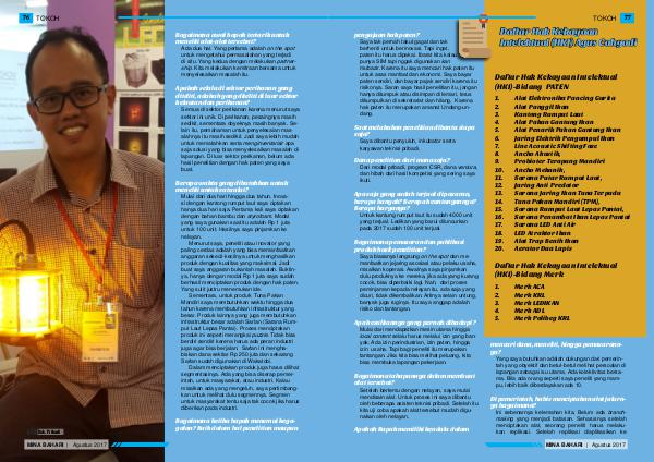 pengajuan hak paten? Saya tak pernah takut gagal dan tak berhenti untuk berinovasi. Tapi ingat, paten itu harus dipakai. Ibarat kita kalau punya SIM tapi nggak digunakan kan mubazir. Karena itu saya mencari hak paten itu untuk asas manfaat dan ekonomi. Saya bayar paten sendiri, dan bayar pajak sendiri karena itu risikonya. Saran saya hasil penelitian itu, jangan hanya ditumpuk atau disimpan di lemari, terus dikumpulkan di sekretariat dan hilang. Karena hak paten itu merupakan amanat Undang-undang.