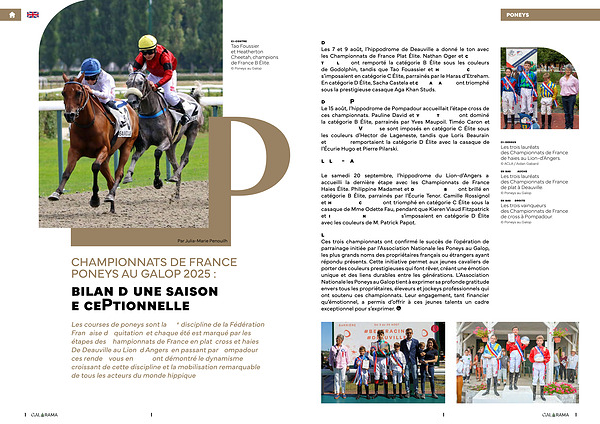 Les 7 et 9 août, l’ hippodrome de Deauville a donné le ton avec les Championnats de France Plat Élite. Nathan Oger et Cwmplas Tiger Lilly ont remporté la catégorie B Élite sous les couleurs de Godolphin, tandis que Tao Fouassier et Heatherton Cheetah s’ imposaient en catégorie C Élite, parrainés par le Haras d’ Etreham. En catégorie D Élite, Sacha Castela et Class Act Annie ont triomphé sous la prestigieuse casaque Aga Khan Studs.