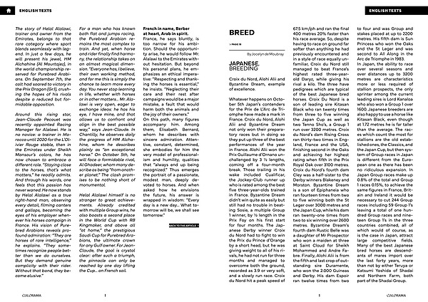 67.5 km / ph and ran the final 400 metres 20 % faster than his race average. So, despite having to race on ground far softer than anything he had previously encountered and in a style of race equally unfamiliar, Croix du Nord still managed to beat France’ s highest rated three-yearold Daryz, while giving his rival a kilo. The three have pedigrees which are typical of the best Japanese bred horses. Croix Du Nord is a son of leading sire Kitasan Black who ran twenty times from three to five winning the Japan Cup as well as two Tenno Sho’ s, a Group 1 run over 3200 metres. Croix du Nord’ s dam Rising Cross ran thirty-two times in England, France and the USA, finishing second in the Oaks and achieving her highest rating when fifth in the Prix Royal Oak over 3100 metres. Croix du Nord’ s fourth dam Cley was a half-sister to the Derby winners Blakeney and Morston. Byzantine Dream is a son of Epiphaneia who ran fourteen times from two to five winning both the St Leger over 3000 metres and the Japan Cup, while his dam ran twenty-one times from two to six winning over 2600 metres. Byzantine Dream’ s fourth dam Rustic Belle was a daughter of Mr Prospector who won a maiden at three at Saint Cloud for Sheikh Mohammed and Andre Fabre. Finally, Alohi Alii is from the fifth and last crop of outstanding sire Duramente, who won the 2.000 Guineas and Derby. His dam Espoir ran twelve times from two to four and was Group and stakes placed at up to 2200 metres. His fifth dam is Sun Princess who won the Oaks and the St Leger and was second to All Along in the Arc de Triomphe in 1983. In Japan, the ability to race over several seasons and over distances up to 3200 metres are characteristics more or less required of stallion prospects, the only sprinter among the current leading sires is Lord Kanaloa who also won a Group 1 over 1600. Japanese breeders are also happy to use a horse like Kitasan Black, even though at 1.72 metres he is far taller than the average. The races which count the most for stallions are the old established ones, the Classics, and the Japan Cup, but then system of Group races in Japan is different from the European one as there has been no ridiculous expansion. In Japan Group races make up 0.8 % of the total and Group 1 races 0.15 %, to achieve the same figures in France, Britain and Ireland it would be necessary to cut 244 Group races including 59 Group 1’ s leaving a total of one hundred Group races and nineteen Group 1’ s in the three countries combined, all of which would of course, as is the case in Japan, attract large competitive fields. Many of the best Japanese bred horses are descendants of mares import over the last forty years, more than not by either Teruya or Katsumi Yoshida of Shadai and Northern Farm, both part of the Shadai Group.