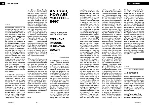 ENGLISH TEXTS prestigious races and carried the most famous silks. He believes that“ the mind is more important than the body, because if your mind goes far, your body follows.” Stéphane Pasquier was born in Nanterre, near Paris.“ In my neighborhood, I was the smallest one, the one they’ d put at the top of the tree! But I managed to end up in a world where that complex turned into a strength.” When he began his apprenticeship with Robert Collet at sixteen, his 1.60m( 5’ 3”) frame was, in fact, an asset. What stood out, however, was the boy’ s fiery character:“ I wasn’ t always well accepted in this world because at first I was a bit hot-headed. That gave me a shell, and now everything just rolls off me. I feel like I have enough mental strength to live my life without too much pressure, precisely because I built my character the hard way. I’ ve worked with the same people for a very long time, and that helps: we go through the good moments together, and the bad ones too. And every hard blow helps you take the next one better.” Pasquier’ s experiences abroad were key in building his mindset:“ I rode in India in the 2010s, and what I saw there really woke me up. Over there, even the person living in the street is smiling and seems happy with what they have. When I face a challenge, like the end of a contract or being taken off a horse I’ d put my heart into, I remind myself that there are people far worse