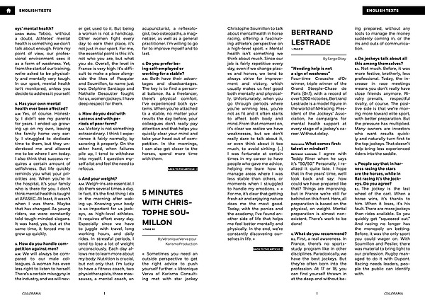 Christophe Soumillon to talk about mental health in horse racing, offering a fascinating athlete’ s perspective on a high-level sport. « Mental health isn’ t something we think about much. Since our job is fairly repetitive every day, even if we change places and horses, we tend to always strive for improvement and victory, which usually makes us feel good both mentally and physically. Unfortunately, when you go through periods where you’ re winning less, you’ re not as fit and it often starts to affect both body and mind. From that moment on, it’ s clear we realize we have weaknesses, but we don’ t really dare to talk about it, or even think about it too much, to avoid sinking.(…) I was fortunate at certain times in my career to have people who gave me advice, helping me learn how to manage areas where I was less stable than others, or moments when I struggled to handle my emotions. » « For me, it’ s clear that getting fresh air and enjoying nature does me the most good. Today, with the ponies and the academy, I’ ve found another side of life that helps me feel better mentally and physically. In the end, we’ re constantly discovering ourselves in life. »