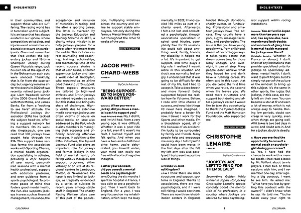 J. P-W. I think there are more structures and support systems in England. Thanks to associations, there are now psychologists, and if I were still riding, I would see them. There are now three rehabilitation centers in England, funded through donations, charity events, or fundraising. Professional and amateur jockeys have free access. They usually have a pool, a gym, massage facilities … and psychologists. The issue is that you have young people who, from childhood, dream of becoming jockeys. It takes years before that dream comes true, for those lucky enough, and overnight, it can all stop. Many people don’ t achieve what they hoped for and don’ t have a fulfilling career. It’ s often said in this sport that you die twice: the first time when you retire, the second when life leaves you. We need more structures and support both during and after a jockey’ s career. I would like to take this opportunity to thank the Injured Jockeys Fund and the Matt Hampson Foundation, who supported me.