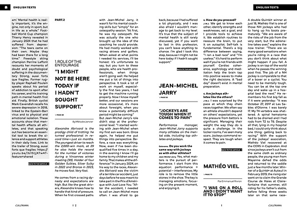 ENGLISH TEXTS back, because I had suffered a lot physically, and I was also afraid I wouldn’ t manage to get back to my level. It’ s true that the subject of mental health is still rarely discussed, yet if you want to last in this profession, you can’ t leave anything to chance. I’ m glad I took this step, because I might not be here today if I hadn’ t sought support.”