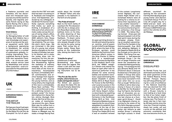 a freelance journalist and translator, she has discovered and introduced racecourses around the world for Equidia, and regularly presents French racing on Sky Sports Racing. She is also a breeder and owner of Thoroughbreds.