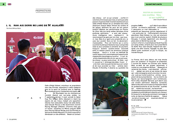 ILS ONT FAIT L’ ACTU des chevaux, voilà ce qui compte », confie-t-il volontiers. Et à travers ses mots, on sent que cette passion n’ a jamais faibli. Il se tient dorénavant aux côtés d’ Helal Alalawi tel un véritable bras droit, observant chaque détail, filmant les canters et les galops, devenant les yeux de son patron lorsqu’ il déplace ses pensionnaires en France. Sa vision des pur-sang arabes témoigne d’ une profonde admiration. « Ce sont des chevaux d’ une intelligence rare », explique-t-il. « Ils reconnaissent les gens parfois mieux que nousmêmes. Mais ils exigent une complicité sincère avec leur cavalier. Sans ce lien, ils deviennent insaisissables. » Pour cet homme qui a connu aussi bien le plat que l’ obstacle, le pur-sang arabe reste le plus complexe à entraîner. Et pourtant, lorsqu’ un binôme cavalier-cheval s’ accorde enfin, la relation prend une dimension presque magique. « Chacun a, je crois, sa méthode de travail, et pour moi c’ est simplement l’ opportunité d’ apprendre davantage aujourd’ hui. On n’ arrête jamais d’ apprendre dans la vie, que ce soit avec les chevaux ou pour autre chose … M. Alalawi est très ouvert, prêt à échanger des idées: il a son œil, j’ ai le mien, cela nous permet de nous confronter et de nous accorder au mieux » précise Jean- Claude. À Chantilly, il observe au quotidien les