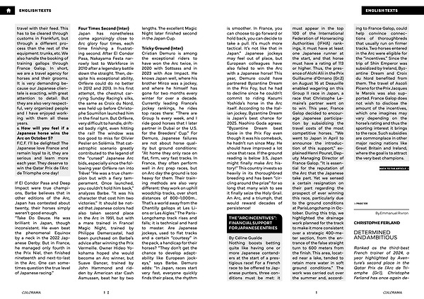 Tricky Ground( Inter) Cristian Demuro is among the exceptional riders to have won the Arc twice, in 2020 with Sottsass and in 2023 with Ace Impact. He knows Japan well, where his brother Mirco was a jockey, and where he himself has gone for two months every winter for over a decade. Currently leading France’ s jockey rankings, he rides top races there:“ There are Group 1s every week, and I ride good horses that I later partner in Dubai or the U. S. for the Breeders’ Cup.” For Demuro, Japanese failures are not about horse quality but ground conditions:“ At home they only race on flat, firm, very fast tracks. In France, they often perform well in Arc prep races, but on Arc day the ground is too heavy for them. Their training methods are also very different: they work on uphill woodchip tracks, over short distances of 800 – 1,000m... That’ s a world away from the Chantilly gallops at Les Lions or Les Aigles.” The Paris- Longchamp track rises and falls; it is technical and hard to master. Are Japanese jockeys, used to flat tracks and a certain“ courtesy” in the pack, a handicap for their horses?“ They don’ t get the chance to develop adaptability like European jockeys,” says Barbe. Demuro adds:“ In Japan, races start very fast, everyone quickly finds their place, the rhythm