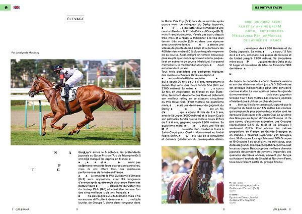 ILS ONT FAIT L’ ACTU le Qatar Prix Foy( Gr. 2) lors de sa rentrée après quatre mois. Le vainqueur du Derby Japonais, Croix du Nord, a dû lutter pour s’ imposer d’ une courte tête dans le Prix du Prince d’ Orange( Gr. 3), mais il rendait du poids, n’ avait pas couru depuis trois mois et a réussi à triompher à la fois d’ un terrain très souple( 3,9) et dans une épreuve avec un rythme lent. Croix du Nord a atteint une vitesse de pointe de 67,5 km / h et a parcouru les 400 derniers mètres 20 % plus vite que la moyenne de sa course. Ainsi, malgré un terrain beaucoup plus souple que tout ce qu’ il avait connu jusquelà et un scénario de course inhabituel, il a quand même battu le meilleur 3 ans français, Daryz, tout en lui rendant un kilo. Tous trois possèdent des pedigrees typiques des meilleurs chevaux élevés au Japon. Croix du Nord est un fils de l’ étalon vedette Kitasan Black, qui a couru 20 fois de 3 à 5 ans, remportant la Japan Cup ainsi que deux Tennō Shō( Gr. 1 sur 3 200 mètres). Sa mère, Rising Cross, a couru 32 fois en Angleterre, en France et aux États- Unis, terminant deuxième des Oaks et obtenant son meilleur rating en se classant cinquième du Prix Royal-Oak( 3 100 mètres). Sa quatrième mère, Cley, était une demi-sœur du gagnant du Derby Blakeney. Byzantine Dream est un fils d’ Epiphaneia, qui a couru 14 fois de 2 à 5 ans, avec le St Leger( 3 000 mètres) et la Japan Cup à son palmarès, tandis que sa mère a couru 21 fois de 2 à 6 ans, gagnant jusqu’ à 2 600 mètres. Sa quatrième mère, Rustic Belle, était une fille de Mr Prospector, lauréate d’ un maiden à 3 ans à Saint-Cloud pour Cheikh Mohammed et André Fabre. Enfin, Alohi Alii est issu de la cinquième et dernière génération du remarquable étalon