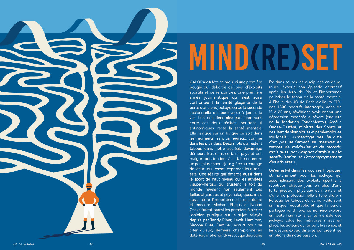 GALORAMA fête ce mois-ci une première bougie qui déborde de joies, d’ exploits sportifs et de rencontres. Une première année journalistique qui s’ est aussi confrontée à la réalité glaçante de la perte d’ anciens jockeys, ou de la seconde accidentelle qui bouleverse à jamais la vie. L’ un des dénominateurs communs entre ces deux réalités, pourtant si antinomiques, reste la santé mentale. Elle navigue sur un fil, que ce soit dans les moments les plus heureux, comme dans les plus durs. Deux mots qui restent tabous dans notre société, davantage démocratisés dans certains pays et qui, malgré tout, tendent à se faire entendre un peu plus chaque jour grâce au courage de ceux qui osent exprimer leur malêtre. Une réalité qui émerge aussi dans le sport de haut niveau où les athlètes « super-héros » qui trustent le toit du monde révèlent non seulement des failles physiques et psychologiques, mais aussi toute l’ importance d’ être entouré et encadré. Michael Phelps et Naomi Osaka furent parmi les premiers à alerter l’ opinion publique sur le sujet, relayés depuis par Teddy Riner, Lewis Hamilton, Simone Biles, Camille Lacourt pour ne citer qu’ eux; dernière championne en date, Pauline Ferrand-Prévot qui décroche l’ or dans toutes les disciplines en deuxroues, évoque son épisode dépressif après les Jeux de Rio et l’ importance de briser le tabou de la santé mentale. À l’ issue des JO de Paris d’ ailleurs, 17 % des 1 800 sportifs interrogés, âgés de 16 à 25 ans, révélaient avoir connu une dépression modérée à sévère( enquête de la fondation FondaMental). Amélie Oudéa-Castéra, ministre des Sports et des Jeux de olympiques et paralympiques soulignait: « L’ héritage des Jeux ne doit pas seulement se mesurer en termes de médailles et de records, mais aussi par l’ impact durable sur la sensibilisation et l’ accompagnement des athlètes ».