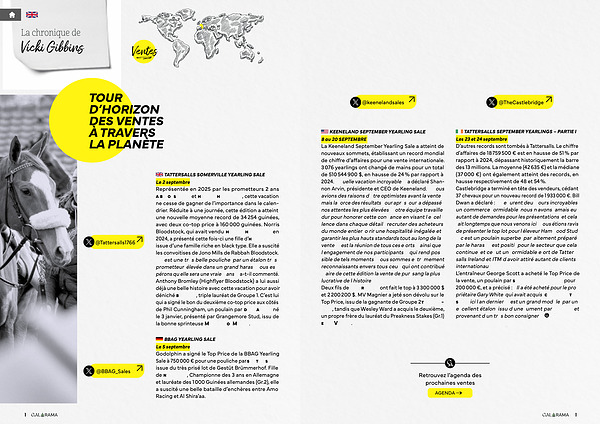 KEENELAND SEPTEMBER YEARLING SALE 8 au 20 SEPTEMBRE La Keeneland September Yearling Sale a atteint de nouveaux sommets, établissant un record mondial de chiffre d’ affaires pour une vente internationale. 3 076 yearlings ont changé de mains pour un total de 510 544 900 $, en hausse de 24 % par rapport à 2024. « Quelle vacation incroyable » a déclaré Shannon Arvin, présidente et CEO de Keeneland. « Nous avions des raisons d’ être optimistes avant la vente, mais la force des résultats, jour après jour, a dépassé nos attentes les plus élevées. Notre équipe travaille dur pour honorer cette confiance en visant l’ excellence dans chaque détail: recruter des acheteurs du monde entier, offrir une hospitalité inégalée et garantir les plus hauts standards tout au long de la vente. C’ est la réunion de tous ces efforts – ainsi que l’ engagement de nos participants – qui rend possible de tels moments. Nous sommes extrêmement reconnaissants envers tous ceux qui ont contribué à faire de cette édition la vente de pur-sang la plus lucrative de l’ histoire. » Deux fils de Gun Runner ont fait le top à 3 300 000 $ et 2 200 200 $. MV Magnier a jeté son dévolu sur le Top Price, issu de la gagnante de Groupe 2 Thoughtfully, tandis que Wesley Ward a acquis le deuxième, un propre frère du lauréat du Preakness Stakes( Gr. 1) Early Voting.