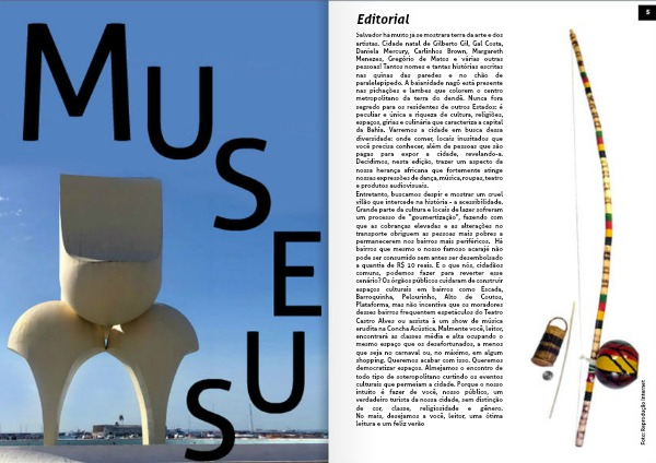 Salvador há muito já se mostrara terra da arte e dos artistas. Cidade natal de Gilberto Gil, Gal Costa, Daniela Mercury, Carlinhos Brown, Margareth Menezes, Gregório de Matos e várias outras pessoas! Tantos nomes e tantas histórias escritas nas quinas das paredes e no chão de paralelepípedo. A baianidade nagô está presente nas pichações e lambes que colorem o centro metropolitano da terra do dendê. Nunca fora segredo para os residentes de outros Estados: é peculiar e única a riqueza de cultura, religiões, espaços, gírias e culinária que caracteriza a capital da Bahia. Varremos a cidade em busca dessa diversidade: onde comer, locais inusitados que você precisa conhecer, além de pessoas que são pagas para expor a cidade, revelando-a. Decidimos, nesta edição, trazer um aspecto da nossa herança africana que fortemente atinge nossas expressões de dança, música, roupas, teatro