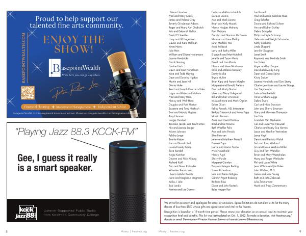 Cedric and Marcia Lofdahl Doriene Loomis Ann and Mark Lorenz Brian and Kelly Macek Nancy Hedges Mahany Pam Mahany Carolyn and Norman McElwain Michael and Jane Melloy Janet Merfeld , MD Anna Milbach Larry and Kathy Miller Elizabeth and Matt Mitchell Janelle and Tyson Morio David and Lisa Morris Nancy and Steve Mortimore Mike and Melanie Moseley Danny Mulka Bryan Mullen Brian Kipp and Aaron Murphy Margaret and Ronald Nelson Don and Marty Norton Steve and Mary Odegaard Bill and Esther O ' Donnell Iris Muchmore and Mark Ogden Esther Olson Kelley Panosh , ASL Interpreter Bedora Sheronick and Kevin Papp Marcia Parman Anne and David Parmley Brad and Liz Parsons Beth Washler Pelic Ann and John Persick Shar Petersen Janey and Matthew Piersall Thomas Popa Carrie and Aaron Pozdol Price Household Nancy Pugh Sherry Purdie Margaret Quinlan Tony and Megan Reding Sarah Richardson John and Karen Roltgen Carolyn Pigott Rosberg Barbara Ross Diane and John Rosteck Babs Haggin Roy