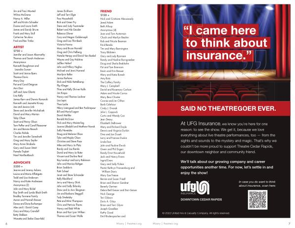 At UFG Insurance , we know you ’ re here for one reason : to see the show . We get it , because we love everything about live theatre performances , too — from the sights and sounds to the mystery and magic . That ’ s why we couldn ’ t be more proud to support Theatre Cedar Rapids , our downtown neighbor and community friend .