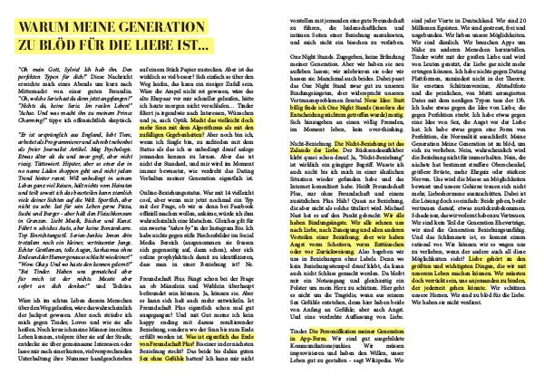 Nicht-Beziehung. Die Nicht-Beziehung ist das Zalando der Liebe. Der Rücksendeaufkleber klebt quasi schon drauf. Ja,“ Nicht-Beziehung” ist wirklich ein gängiger Begriff. Wusste ich auch nicht bis ich mich in einer ähnlichen Situation wieder gefunden habe und das Internet konsultiert habe. Heißt Freundschaft Plus, nur ohne Freundschaft und einem zusätzlichen Plus. Häh? Quasi ne Beziehung, die aber nicht als solche tituliert wird. Michael Nast hat es auf den Punkt gebracht: Wir alle haben Bindungsängste. Wir alle sehnen uns nach Liebe, nach Zuneigung und allen anderen Vorteilen einer Beziehung; aber wir haben Angst vorm Scheitern, vorm Enttäuschen oder vor Zurückweisung. Also begeben wir uns in Beziehungen ohne Labels. Denn wo kein Beziehungsstempel drauf klebt, da kann auch nicht Schluss gemacht werden. Da bleibt mir ein Notausgang und gleichzeitig ein Polster um mein Herz zu schützen. Hier geht es nicht um die Tragödie, wenn aus reinem Sex Gefühle entstehen, denn hier haben beide von Anfang an Gefühle; aber auch Angst. Und eine verdrehte Auffassung von Liebe. sind jeder Vierte in Deutschland. Wir sind 20 Millionen Egoisten. Wir sind gestresst, frei und ungebunden. Wir lieben unsere Möglichkeiten. Wir sind dämlich. Wir brauchen Apps um Nähe zu anderen Menschen herzustellen. Tinder wirbt mit der großen Liebe und wird von Leuten genutzt, die Liebe gar nicht mehr ertragen können. Ich habe nichts gegen Dating Plattformen, zumindest nicht in der Theorie. Sie ersetzen Schützenvereine, Altstadtfeste und die peinlichen, von Mutti arrangierten Dates mit dem nerdigen Typen taus der 13b. Ich habe etwas gegen die Idee von Liebe, die gegen Perfektion strebt. Ich habe etwas gegen eine Idee von Sex, die Angst vor der Liebe hat. Ich habe etwas gegen eine Form von Perfektion, die Normalität ausschließt. Meine Generation Meine Generation ist zu blöd, um sich zu verlieben. Nein, wahrscheinlich wird die Beziehung nicht für immer halten. Nein, die nächste hat bestimmt straffere Oberschenkel, größere Brüste, mehr Ehrgeiz oder stärkere Nerven. Uns wird die Masse an Möglichkeiten bewusst und unsere Gehirne trauen sich nicht mehr, Liebeshormone auszuschütten. Dabei ist die Lösung doch so einfach: Beide geben, beide vertrauen darauf, etwas zurückzubekommen. Schade nur, das wir verlernt haben zu Vertrauen. Wir sind kein Teil der Generation Eheverträge, wir sind die Generation Beziehungsunfähig. Und das Schlimmste ist, es kommt einem rational vor. Wie können wir es wagen uns zu verlieben, wenn der andere auch all diese Möglichkeiten sieht? Liebe gehört zu den größten und wichtigsten Dingen, die wir mit unserem Leben machen können. Wir müssten doch verrückt sein, uns an jemanden zu binden, der jederzeit gehen könnte. Wir schützen unsere Herzen. Wir sind zu blöd für die Liebe. Wir haben sie nicht verdient.
