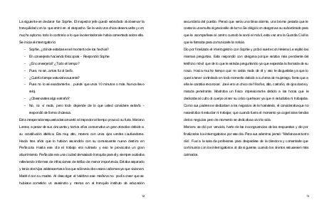 La siguiente en declarar fue Sophie. El inspector jefe quedó extrañado al observar la tranquilidad con la que entró en el despacho. Se la veía una chica desenvuelta y con mucho aplomo, todo lo contrario a lo que la orientadora le había comentado sobre ella. Se inicia el interrogatorio: Sophie, ¿ dónde estabas en el momento de los hechos? En conserjería haciendo fotocopias Respondió Sophie ¿ En conserjeria? ¿ Todo el tiempo? Pues, no sé... antes fui al baño. ¿ Cuánto tiempo estuviste ausente? Pues no lo sé exactamente … puede que unos 10 minutos o más. Nunca llevo reloj. ¿ Observastes algo extraño? No, no ví nada, pero todo depende de lo que usted considere extraño respondió de forma chulesca. Esta inesperada respuesta desconcertó al inspector al tiempo provocó su furia. Mariano Larrea, a pesar de sus cincuenta y tantos años conservaba un gran atractivo debido a su constitución atlética. Era muy alto, moreno con unos ojos verdes cautivadores. Hacía tres años que lo habían ascendido con su consecuente nuevo destino en Peñíscola. Hasta ese día el trabajo era rutinario y eso le provocaba un gran aburrimiento. Peñíscola era una ciudad demasiado tranquila para él y siempre acababa rellenando informes de infracciones de tráfico de menor importancia. Estaba separado y tenía dos hijos adolescentes a los que sólo veía dos veces cada mes ya que vivían en Madrid con su madre. Al descolgar el teléfono ese mañana no podía creer que se hubiese cometido un asesinato y menos en el tranquilo instituto de educación