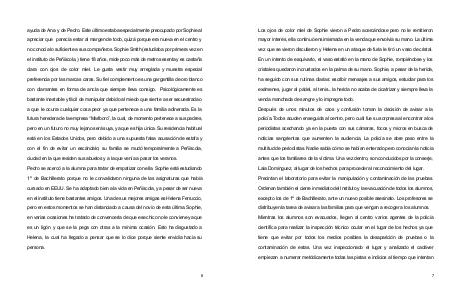ayuda de Ana y de Pedro. Este último estaba especialmente preocupado por Sophie al apreciar que parecía estar al margen de todo, quizá porque era nueva en el centro y no conocía lo suficiente a sus compañeros. Sophie Smith( estudiaba por primera vez en el instituto de Peñíscola,) tiene 18 años, mide poco más de metro sesenta y es castaña clara con ojos de color miel. Le gusta vestir muy arreglada y muestra especial preferencia por las marcas caras. Su fiel complemento es una gargantilla de oro blanco con diamantes en forma de ancla que siempre lleva consigo.