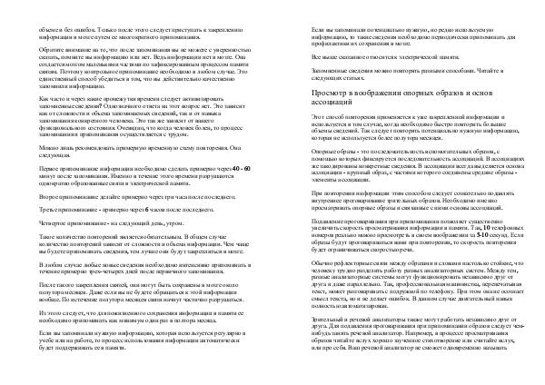 объеме и без ошибок. Только после этого следует приступать к закреплению информации в мозге путем ее многократного припоминания.