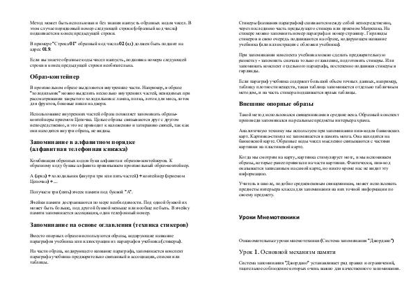 Метод может быть использован и без знания наизусть образных кодов чисел. В этом случае порядковый номер следующей строки( образный код числа) подшивается в конец предыдущей строки.