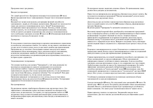 Перед тем как тренироваться на программе, образные коды следует заучить. Вы не сможете пользоваться программой " Мастер запоминания ", если не знаете образных кодов двузначных чисел.