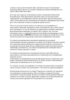 После того, как вы осилите объем в сто образов, не успокаивайтесь и продолжайте ежедневно наращивать объем запоминаемых чисел. Мой личный опыт показывает, что для достижения состояния сверхустойчивого внимания( постпроизвольное внимание, состояние СК-1, самадхи- все эти слова обозначают одно и то же), необходимо достичь объема запоминаемых за один раз сведений, равного 250-300 двузначных чисел( образов, связей). После этого объема вам уже будет безразлично, какой объем информации запоминать.