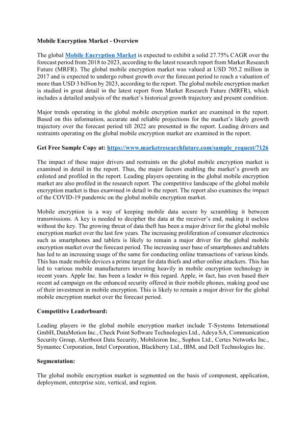 Mobile Encryption Market is expected to exhibit a solid 27.75 % CAGR over the forecast period from 2018 to 2023 , according to the latest research report from Market Research Future ( MRFR ). The global mobile encryption market was valued at USD 705.2 million in 2017 and is expected to undergo robust growth over the forecast period to reach a valuation of more than USD 3 billion by 2023 , according to the report . The global mobile encryption market is studied in great detail in the latest report from Market Research Future ( MRFR ), which includes a detailed analysis of the market ’ s historical growth trajectory and present condition .