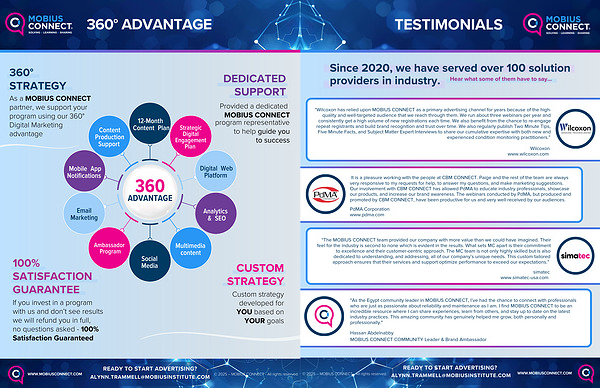 “ Wilcoxon has relied upon MOBIUS CONNECT as a primary advertising channel for years because of the highquality and well-targeted audience that we reach through them . We run about three webinars per year and consistently get a high volume of new registrations each time . We also benefit from the chance to re-engage repeat registrants and build brand recognition and trust over time . We also regularly publish Two Minute Tips , Five Minute Facts , and Subject Matter Expert Interviews to share our cumulative expertise with both new and experienced condition monitoring practitioners .”