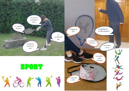 La veste de survĂȘtement bleue La raquette de tennis Le survĂȘtement gris Les baskets blanches et roses SPORT