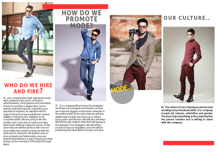 5) Our company will promote the magazine via Facebook, instagram and tweeter, as they are today the biggest social media networks in the entire world. At the same time we will hire well known models and actresses to attract more public and teh fans. We will also advertise MODE through onlinde adds that will appear in the websites of to disaigners. We will attract people to buy our magazine, since we will be promoting the latest fashion trends, and style.
