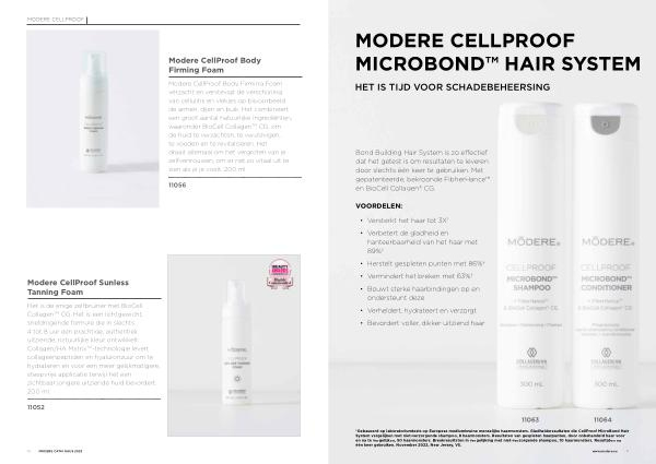 † Gebaseerd op laboratoriumtests op Europese mediumbruine menselijke haarmonsters . Gladheidsresultaten die CellProof MicroBond Hair System vergelijken met niet-verzorgende shampoo , 8 haarmonsters . Resultaten van gespleten haarpunten , door onbehandeld haar voor en na te vergelijken , 50 haarmonsters . Breekresultaten in vergelijking met niet-verzorgende shampoo , 10 haarmonsters . Resultaten na één keer gebruiken . November 2022 , New Jersey , VS . www . modere . eu 41