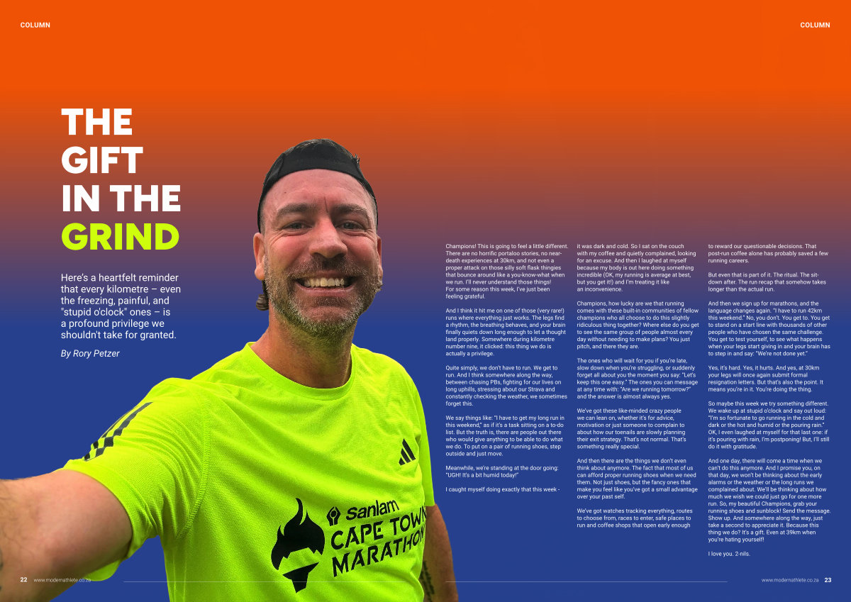 And one day, there will come a time when we can’ t do this anymore. And I promise you, on that day, we won’ t be thinking about the early alarms or the weather or the long runs we complained about. We’ ll be thinking about how much we wish we could just go for one more run. So, my beautiful Champions, grab your running shoes and sunblock! Send the message. Show up. And somewhere along the way, just take a second to appreciate it. Because this thing we do? It’ s a gift. Even at 39km when you’ re hating yourself!