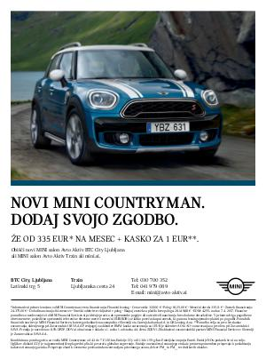 * Informativni primer izračuna za MINI Countryman: vrsta financiranja: Finančni leasing • Cena vozila: 32.500 € • Polog: 8.125,00 € • Mesečni obrok: 335,11 € • Znesek financiranja: 24.375.00 € • Doba financiranja: 84 mesecev • Stroški odobritve: vključeni v polog • Skupaj znesek za plačilo brez pologa: 28.149,88 € • EOM: 4,25 % na dan 7. 4. 2017. Finančne ponudbe so neobvezujoče in MINI Financial Services si pridržuje pravico do spremembe pogojev ali zavrnitve financiranja brez dodatne obrazložitve. V primeru dviga pogodbene obrestne mere, posledično spremembi referenčne obrestne mere( 3 mesečni EURIBOR), se lahko poveča skupni znesek, ki ga mora leasingojemalec plačati po pogodbi. Ponudnik finančnih storitev je MINI Financial Services, katerega ekskluzivna zastopnika v Sloveniji sta Gorenjska banka d. d. in GB Leasing d. o. o. ** Ponudba velja za prvo leto kasko zavarovanja, sklenjenega pri Zavarovalnici SAVA d. d. Predpogoj za sklenitev BMW kasko zavarovanja za 1 EUR je sklenitev AO in AO + zavarovanja za prvo leto pri Zavarovalnici SAVA. Premija je navedena z 8,5 % DPZP. DDV ni obračunan v skladu s 1. točko 1. odstavka 44. člena ZDDV-1. Ekskluzivni zavarovalniški partner MINI Financial Services v Sloveniji je Zavarovalnica SAVA d. d..