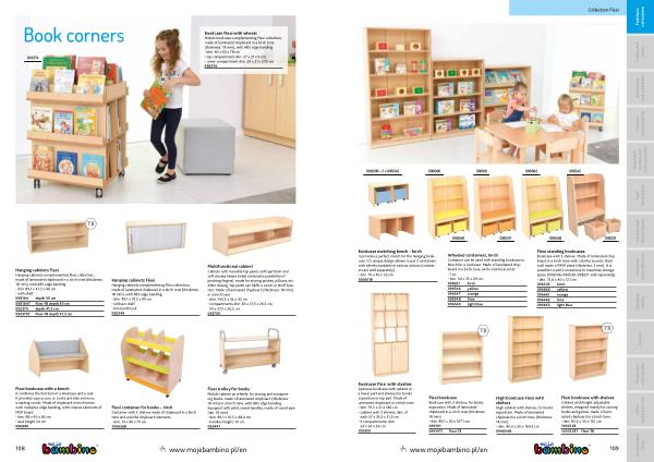 Flexi bookcase with a bench It combines the function of a bookcase and a seat . It provides easy access to books and also serves as a reading corner . Made of chipboard in birch tones , with multiplex edge banding , with colored elements of MDF board .