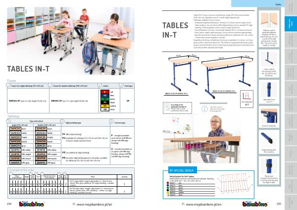 Tables IN-T come in two sizes of tabletops : single ( 70 x 50 cm ) and double ( 130 x 50 cm ). Available in size 3 – 7 ( with height adjustment ). Tabletops available in two versions : – laminated chipboard ( thickness : 18 mm ), in 5 colours : beech , maple , birch , white and grey . You can choose ABS edge banding , 2 mm or durable PU edge banding , 4 mm ( available colours : beech , maple and birch );