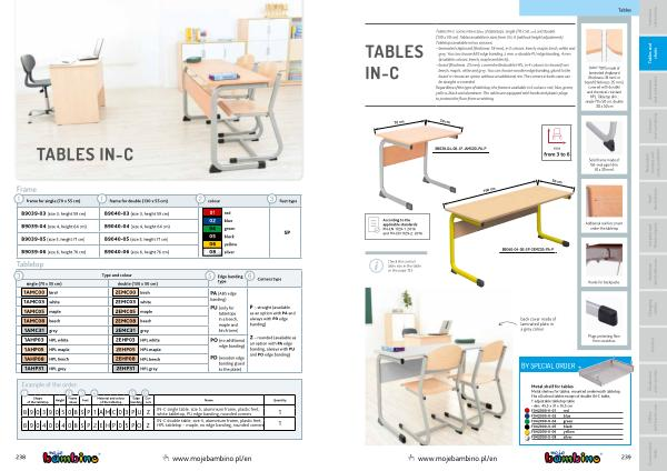 Tables IN-C come in two sizes of tabletops : single ( 70 x 50 cm ) and double ( 130 x 50 cm ). Tables available in sizes from 3 to 6 ( without height adjustment ). Tabletops available in two versions : – laminated chipboard ( thickness : 18 mm ), in 5 colours : beech , maple , birch , white and grey . You can choose ABS edge banding , 2 mm or durable PU edge banding , 4 mm ( available colours : beech , maple and birch );