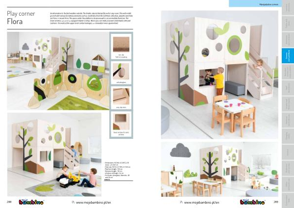 An alternative to the bad weather outside . The bright , natural design fits well in any room . The wall motifs go well with various furnishing elements such as : wardrobes from the Echtholz collection , Quadro wardrobe set Flora or carpet Flora . The space under the platform is large enough to accommodate furniture . The lower window can serve as a puppet theater or shop . Above you can make yourself comfortable with seat cushions . The walls of the upper level contain bullages , so a beautiful view is guaranteed .