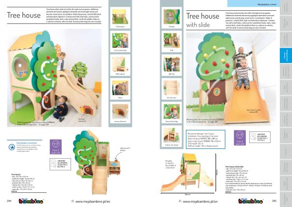 Tree house will provide a lot of fun through exercise games . Additional elements and sensory appliques stimulate touch and sight senses and develop visual-motor coordination . Made of plywood , colorful MDF plate and laminated chipboard . Contains tree with a ball tube , cotton pocket assembled inside , stairs , maze and porthole . Under the platform there is a cabinet on wheels , with one shelf . 8 sensory bean bags are also included .