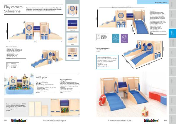 Submarine 3 Play corner with tunnel covered with blue , transparent plexi . Made of plywood and laminated chipboard and wood . Corner is also equipped with mattress-wave , movable maze , window and platforms covered with fitted carpet .