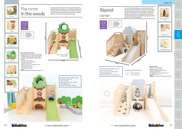 A corner for the little mountain lover , with a slide and a wall that can be climbed . Subdued colors make it fit into any interior and will make the kids have fun in kindergarten . An additional attraction is the shift , mirror and large teddy bear application with belly covered with fur . Corner made of plywood , wood , laminated chipboard and colorful MDF plate , slide slide made of plywood covered with HPL laminate .