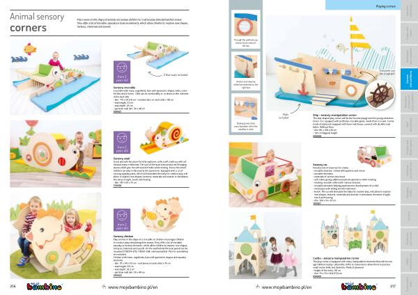 Play corners in the shape of animals encourage children to creative play stimulating their senses . They offer a lot of movable , squeaky or texture elements , which allow children to explore new shapes , textures , materials and sounds .