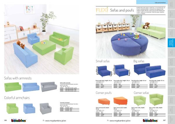 Aesthetically made sofas on metal legs , covered with soft , nice in touch upholstered fabric . Dimensions are adapted to the children ’ s height . Wooden construction provides stability and comfort . Seats are on metal feet . Perfect for play , relaxation corners or libraries .